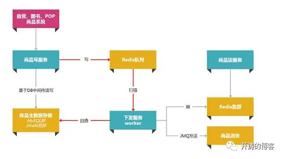 最初的商品变动时,只需要通知WMS系统, 因为采购入库时,仓库需要核实商品信息。随着整个京东服务化进程的推进,搜索、单品页等系统都希望得到通知。因此规划了下发服务,在商品信息变动后,异步通知这些系统。将商品信息入库后,同步写”操作日志”到Redis队列,再由worker异步从Redis中取日志,拿到变动变更的skuSKU,组装信息化发MQ消息出去。此时的消息采取通用化设计,例如基本信息MQ、特殊属性MQ等。