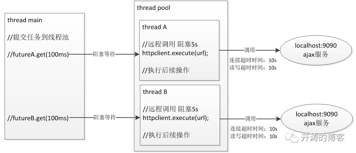主线程阻塞在两个带超时的Future等待上,Future在等待线程池任务执行结束,Future的超时时间设置为100ms,所以很快就超时并返回了,主线程继续执行,在《亿级流量》中我们用到了很多这种方法进行并发获取数据和降级或熔断处理;